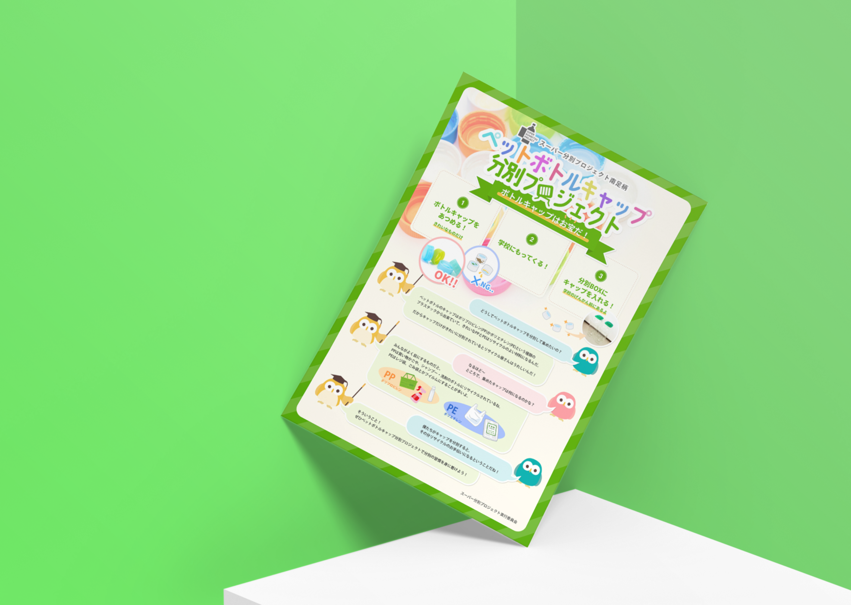 ペットボトルキャップのリサイクルの仕組みを楽しく学習できる、というイメージが伝わるように作成しました。 具体的に、フォントは細字で角のあるものを採用してスマートな印象にしつつも、カラフルな色遣いでコントラストを作り、子供たちの印象に残りやすくしました。 また、「ぺ」や「プ」の半濁音を“◎”にしてキャップの形に見立てたり、「プロジェクト」の「ロ」の字をキャップの形にして、楽しく学習できる雰囲気を演出しました。